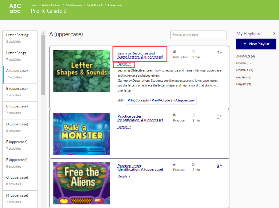 Previewing activities in the Activity Explorer in Imagine Language & Literacy Imagine Learning